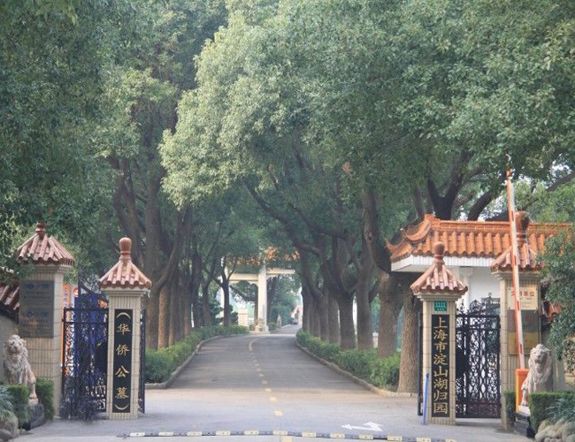 上海市淀山湖归园公墓(上海华侨公墓)是为满足华侨、港、澳、台同胞叶落归根的愿望,经市政府批准,成为上海目前唯一可棺葬也可骨灰葬、骨灰寄存及牌位寄放的大型园林式古建筑公墓。